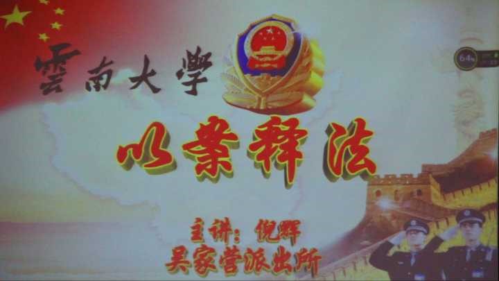 党课结束后,外院还请到了呈贡区吴家营街道派出所的倪辉警官为同学们进行《以案释法》的安全知识教育。他运用云大等的实际案例对学生进行了安全教育,强调了作为青年的我们应该铭记社会主义核心价值观并切实落实。