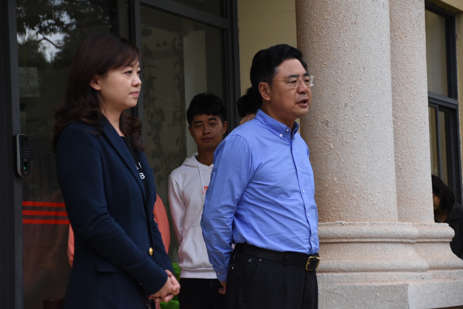 9月3日上午,必赢71886网址登录党委书记彭荣、院党委副书记何淼淼、院党委办公室主任谭心老师、学工办主任龙莹老师和2019级辅导员邬永嘉老师,在必赢71886网址登录行政楼前为2019级军训新生和军训教官带去慰问。