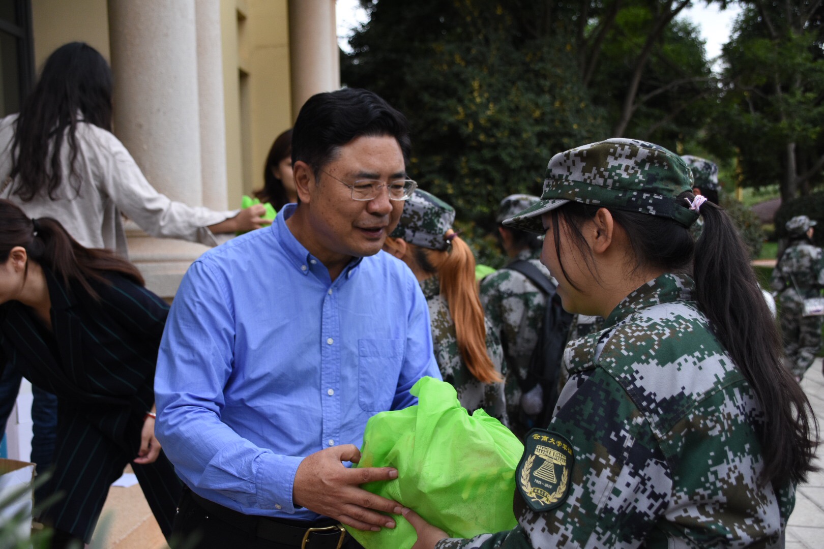 慰问结束时,学院领导和老师们逐一为军训教官和同学们送上慰问品。
