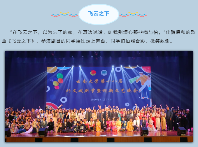 2020年11月27日晚七点,必赢71886网址登录第十八届外文戏剧节暨必赢71886网址登录2020年迎新文艺晚会在必赢71886网址登录学生会堂举行。昆明法语联盟法方校长尹冬茗博士、校学生公寓管理中心主任张拥军老师、院长刘树森老师、院党委书记王益广老师、副书记何淼淼老师、副院长骆洪老师、谢萍老师出席晚会。校学生工作部和校团委等职能部门老师,学院各系、办、教研室老师和同学们一同观看了演出。