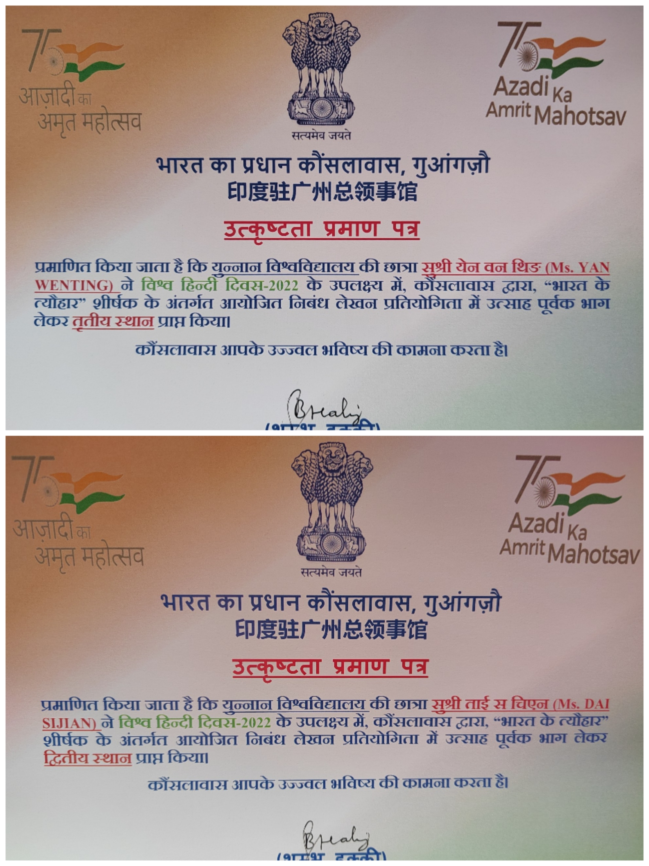 2022年3月31日,由印度驻广州总领事馆举办的2022年度“世界印地语日”庆祝活动暨大赛表彰大会在线上举行。我院印地语专业2019级学生代思佳和严文婷在征文大赛中分别斩获二等奖和三等奖。