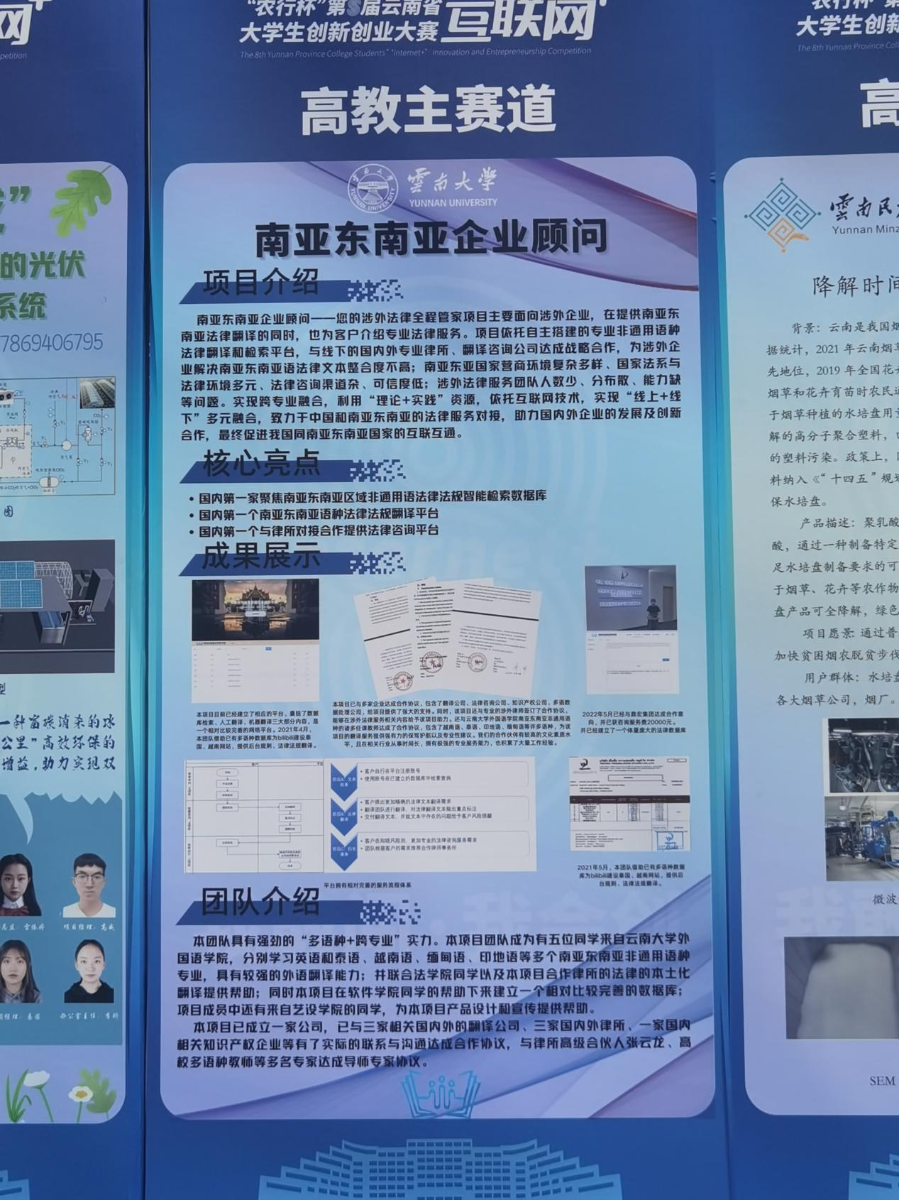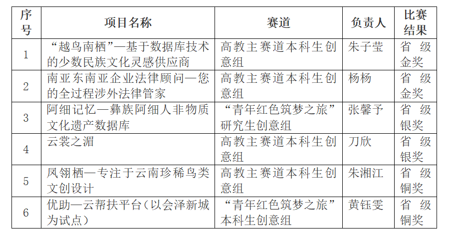进入7月的省内评审阶段,必赢官网6个晋级省赛的项目均顺利通过省内初审。其中高教主赛道的《“越鸟南栖”—基于数据库技术的少数民族文化灵感供应商》、《南亚东南亚企业法律顾问—您的全过程涉外法律管家》项目和“青年红色筑梦之旅”赛道的《阿细记忆—彝族阿细人非物质文化遗产数据库》项目入围省级金奖争夺赛现场路演决赛。