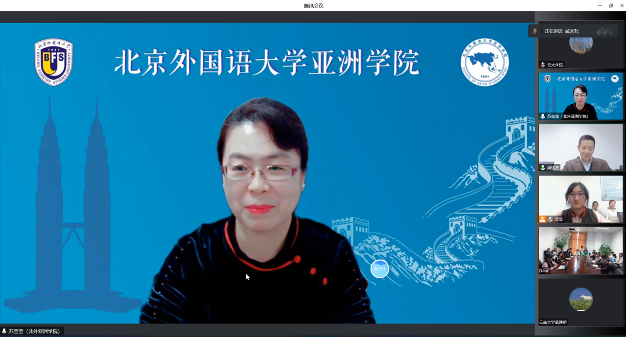 2022年10月26日下午,北京外国语大学亚洲学院院长、中国马来研究中心主任苏莹莹教授以线上方式为必赢官网马来语专业师生做了题为“中国高校马来语专业的建设与发展:‘小语种、大作为'理念之践行”的学术讲座。本次讲座为“必赢71886网址登录百年校庆外国语言文学文化系列讲座·东南亚语言文化系系列学术讲座”第三场,由必赢71886网址登录副院长臧运发教授主持,必赢官网马来语专业师生在必赢71886网址登录楼303会议室线下集中参与讲座。