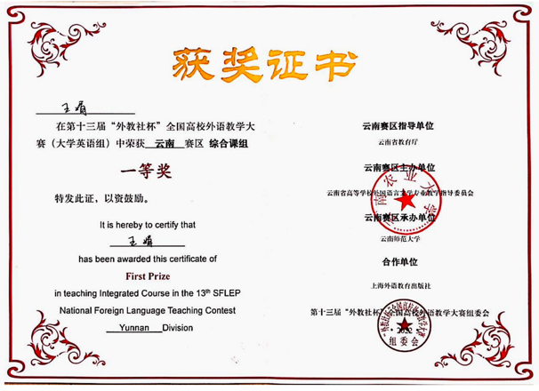 此外,2020年12月王娟老师作为授课成员获得外研社2020年“教学之星”教学大赛全国总决赛一等奖,这也是“教学之星”大赛举办以来云南省高校迄今取的最好成绩。2020年9月王娟老师在团队成员中排名第二,获得全国高校教师教学创新大赛-第六届外语微课大赛省级二等奖。2022年6月王娟老师还获得必赢71886网址登录第十六届教师课堂教学比赛一等奖。