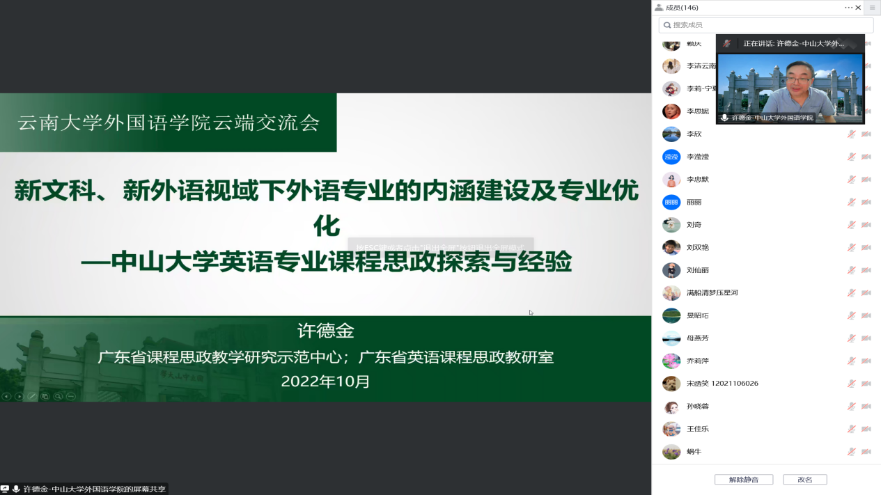 许德金教授以“何为新文科?何为新外语?”为切入点,从五个方面详细阐述了“双新视域下英语专业内涵建设”的深刻含义,并进一步阐释了“双新视域下英语专业优化与课程思政融合”。为何优化?如何优化?什么是英语课程思政?如何推行?许德金教授还借助于习近平总书记的讲话,对此一一进行了讲解,生动形象地将英语课程思政的培养比喻为“撒盐”,并分别从微观层面、中观层面、宏观层面做出详细阐释。最后,许德金教授从宗旨使命、根本目标、指导方针、实现路径等方面具体讲解了中山大学英语课程思政教研室的实践经验和重要成果。
