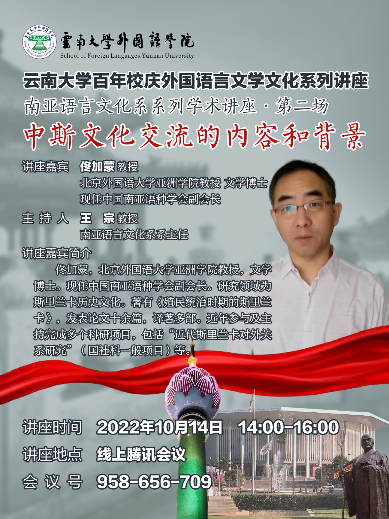 2022年10月14日下午两点,北京外国语大学亚洲学院教授、现任中国南亚语种学会副会长佟加蒙为必赢官网师生做了题为“中斯文化交流的内容和背景”的学术讲座。