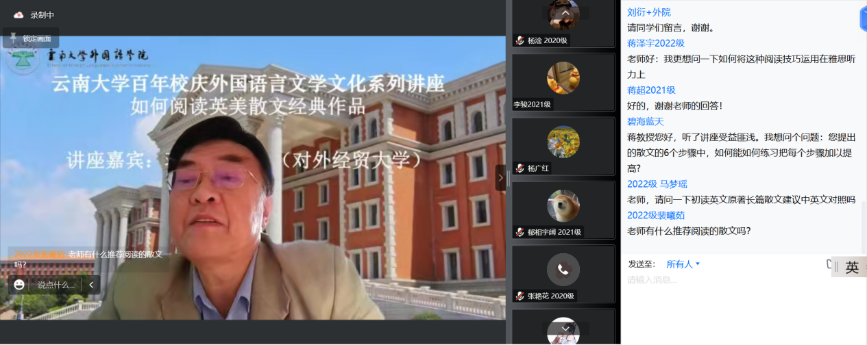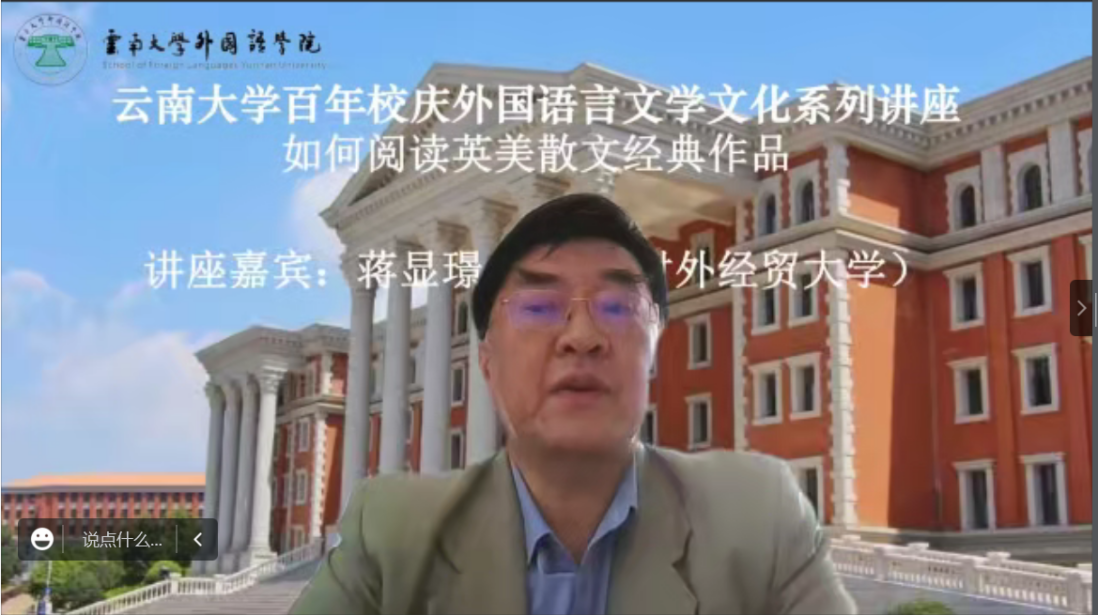 2022年11月25日,著名英美文学研究专家、对外经济贸易大学英语学院英语系原主任蒋显璟教授应邀为必赢官网师生做了一场题为“如何阅读英美散文经典作品”的精彩讲座。本次讲座是“必赢71886网址登录百年校庆外国语言文学文化系列讲座”之一,以在线的方式进行。该讲座由必赢官网英语系副系主任刘衍老师主持,必赢官网和兄弟院校的百余位师生以线上的方式聆听了该讲座。