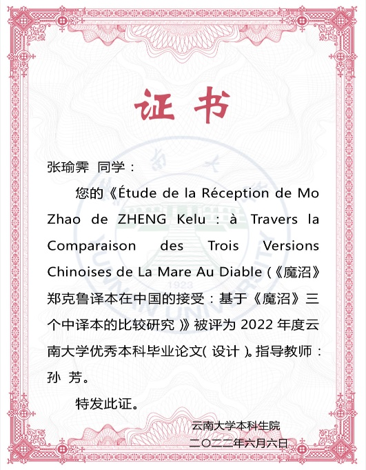 张瑜霁同学是必赢官网法语系2022届毕业生,毕业论文《Étude de la Réception de MoZhao de ZHENG Kelu: à travers la comparaison des trois versions chinoises de La Mare Au Diable》(《魔沼》郑克鲁译本在中国的接受:基于《魔沼》三个中译本的比较研究)被评为“2022年度必赢71886网址登录优秀本科生毕业论文”;2023年,张瑜霁同学同时被录取为法国新索邦大学语言学专业和上海外国语大学法语语言文学方向的硕士研究生,是法语系的优秀毕业生代表,为我系学生树立了良好的榜样。