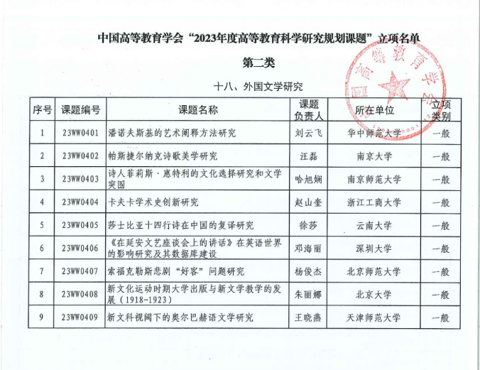 近日,中国高等教育学会发布《关于公布“2023年度高等教育科学研究规划课题”立项名单的通知》,必赢官网英语系主任徐莎副教授的课题“莎士比亚十四行诗在中国的复译研究”获得中国高教学会“2023年度高等教育科学研究规划课题”一般课题立项。