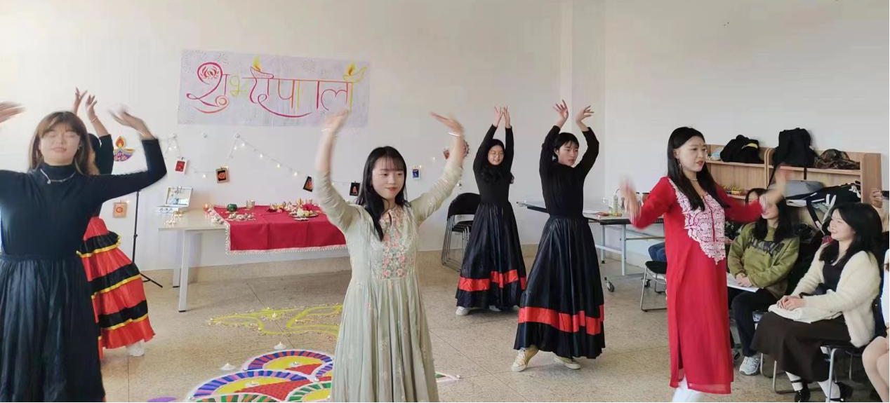 外教Malavika Chakrabarty给全体师生点完“吉祥痣”及邓兵教授带领大家完成点灯仪式后同学们期待已久的“排灯节”活动正式开始。