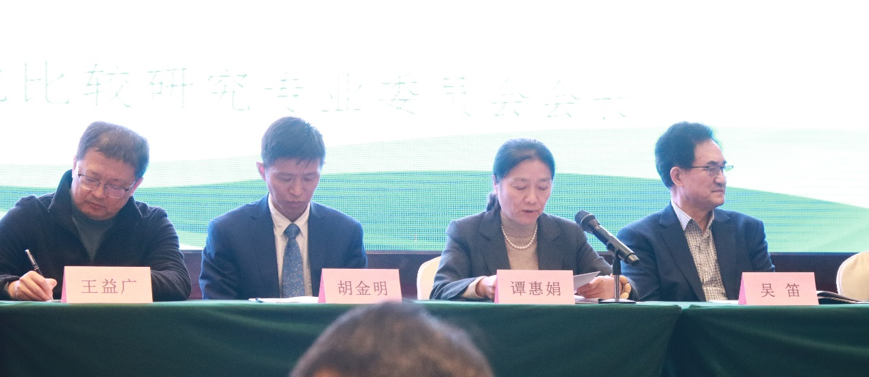 左起:必赢71886网址登录党委书记王益广、必赢71886网址登录副校长胡金明、中非语言文化比较研究专业委员会会长谭惠娟、中外语言文化比较学会会长吴笛