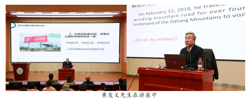 在讲座中,黄友义先生聚焦翻译实践,以专业译者和审稿人的视角,从“透过字面译实质”“追根问底求精准”“国际传播重效果”三个方面深度解读,通过典型的翻译案例与现场师生探讨如何避免字对字的简单直译,努力抓住中文的实质含义,采用外国受众所熟悉的表达方式,用融通中外的语言来讲述中国故事。他提出,对外翻译切记一翻了之,重在语言、思维和文化三个方面的平稳沟通。讲述中国故事,译者要心中有外国受众,提供高水平的翻译,加强我国国际传播的影响力、感召力、亲和力、说服力、引导力。